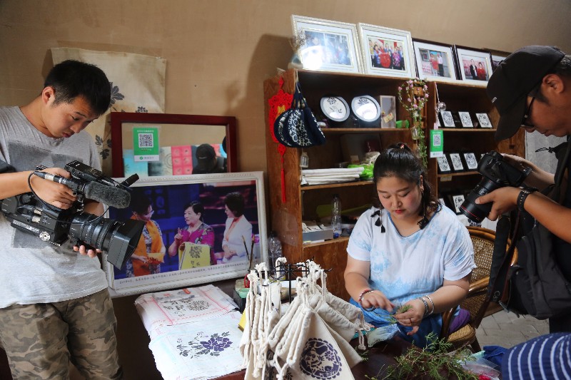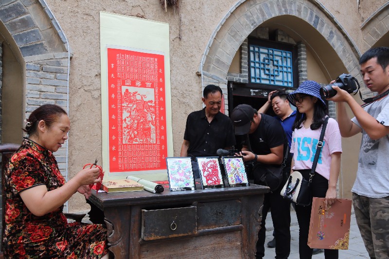张珏一行首先来到陕州地坑院剪纸院和捶草印花院,观看了特色艺术表演。剪纸艺人黄亮娥边唱边剪、生动有趣的表演吸引了记者们,他们抓拍下许多精彩的镜头。在捶草印花院内,随着棒槌声的高低起伏,一幅精美的捶草印花作品呈现在记者眼前,他们拍摄了许多精彩画面。