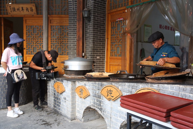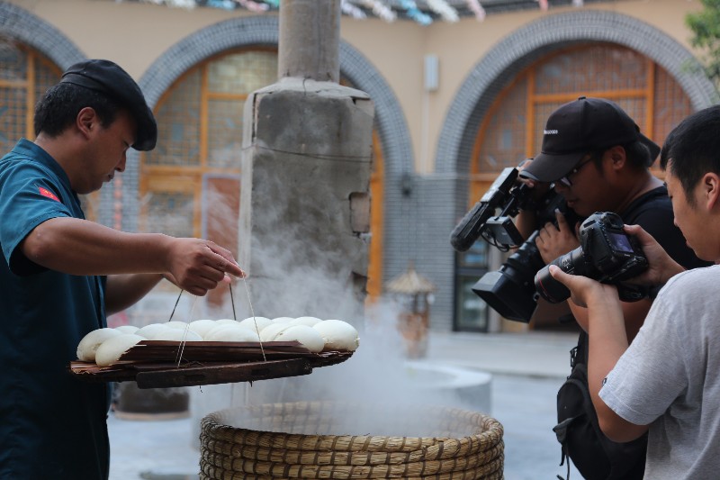 在陕州地坑院金鑫院内,陕州十碗席的和草圈馍制作方法也吸引了记者的注意力,他们现场对餐饮专家和游客进行了采访,并对制作方法和过程进行了拍摄。