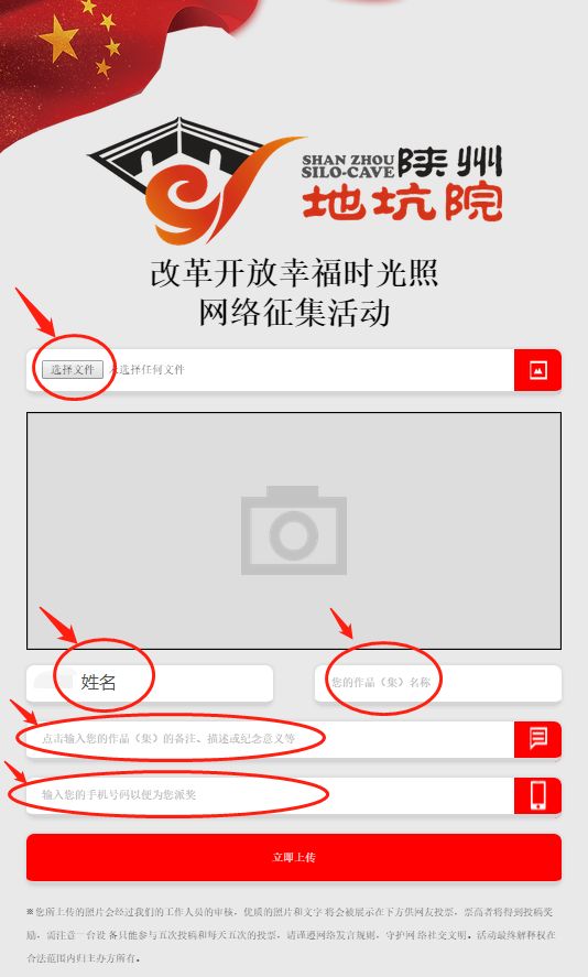 接下来点击【选择文件】选择要上传的图片,填写相关信息(姓名、作品(集)名称、作品(集)的备注、描述或纪念意义等、手机号码),所有信息填完后点击【立即上传】,显示【上传成功】即视为参与活动成功。